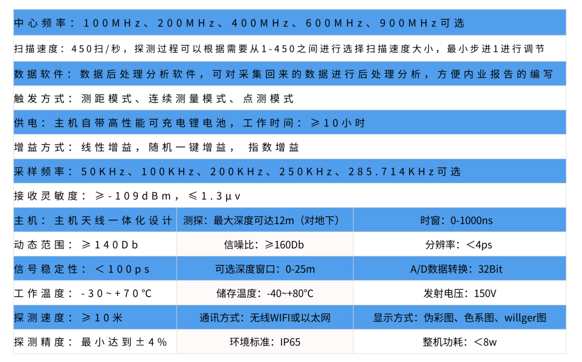 可检测不同岩层的深度和厚度,地下水位探测,冻土边界及厚度等探测;