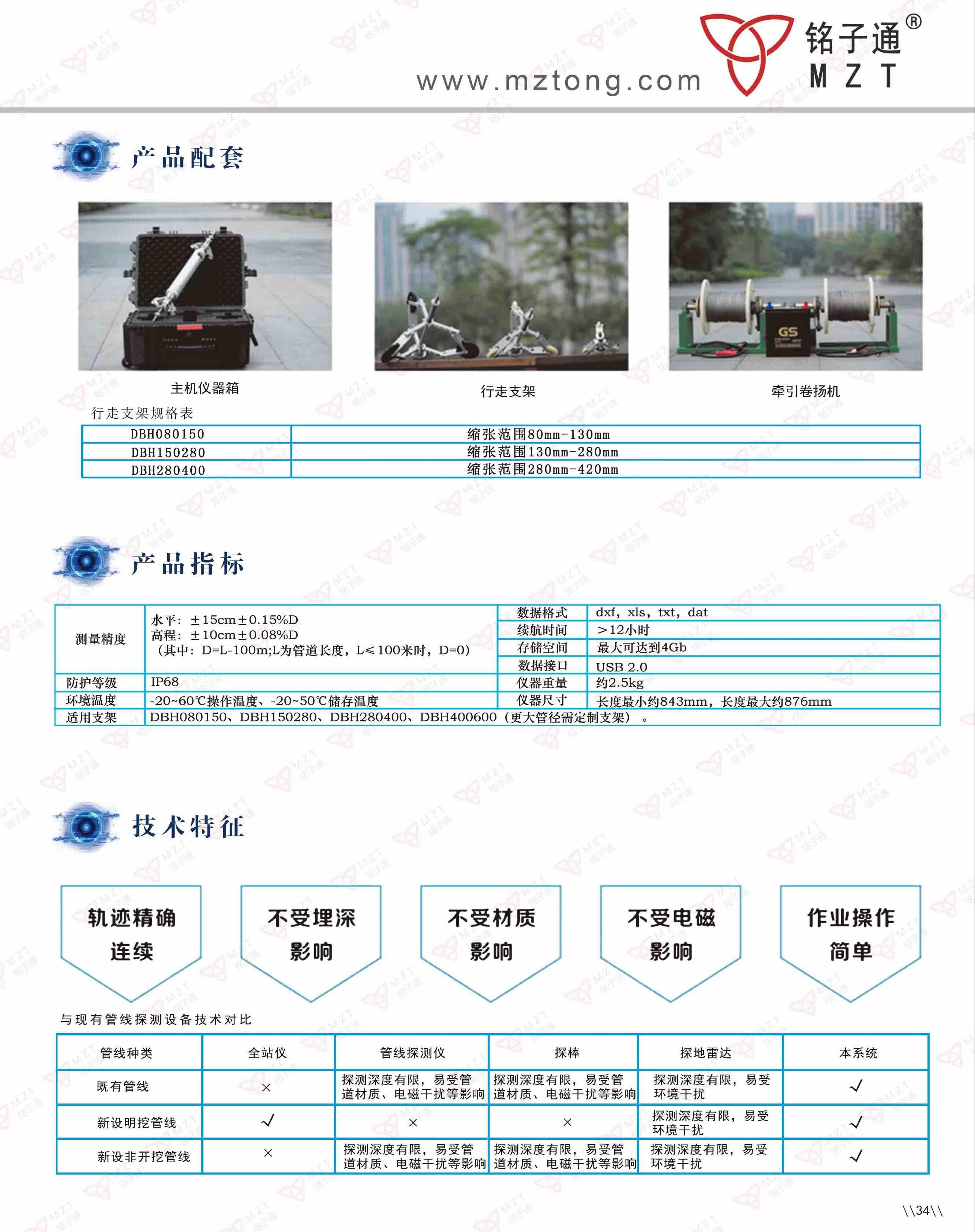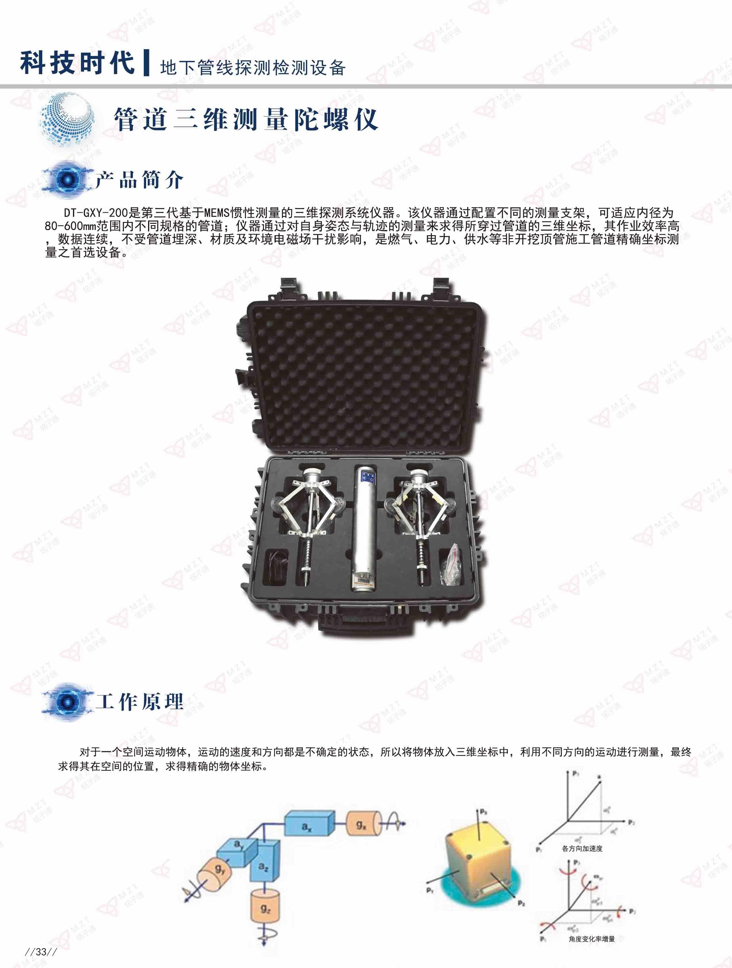 以GXY-200管道三维姿态测量仪为例,它是一款基于MEMS惯性测量技术的管道探测设备,设备在牵引的作用下在管道中前行,并实时对自身姿态与位置进行测量,通过计算得到相应的运动轨迹;同时,仪器结构有效保证了运动过程中测量中心和管道中心的一致性,准确给定管道起终点坐标及管道中心的连续三维坐标,在非开挖的情况下,准确获知管道在地下位置及分布姿态。