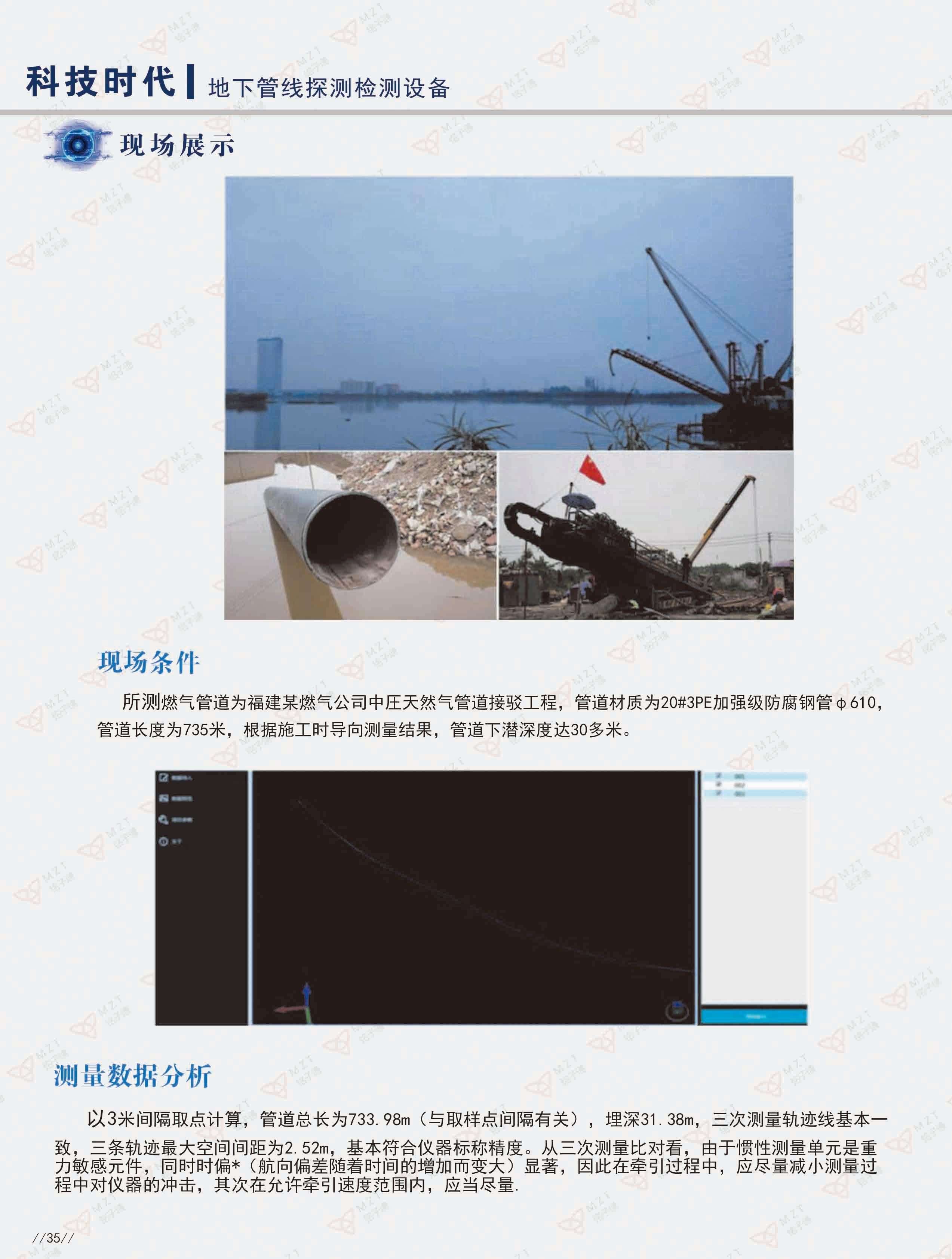 随着城市建设的飞速发展,燃气、排水、电力、化工、通讯等行业常常需要穿越铁路、公路、河流等障碍物敷设管道,非开挖穿越管线施工技术敷设的管线埋藏深、位置不准确,缺乏有效探测手段。基于对城市市容环境的考虑,在城市建成区利用非开挖穿越管线施工技术敷设管线的情况也越来越多,由于敷设的管线具有埋深深、位置信息不准确等特点,而常规的管线探测仪等由于自身的局限性(探测深度浅、易受电磁干扰、场地地形可通达的条件差等)无法获得较准确的管线位置信息,导致后期交叉施工时易破坏、破坏后修复成本高且极易酿成人员伤亡事故。同时在城市规划管理过程中,因地下管线位置信息不准确,也造成地下空间资源的极大浪费。